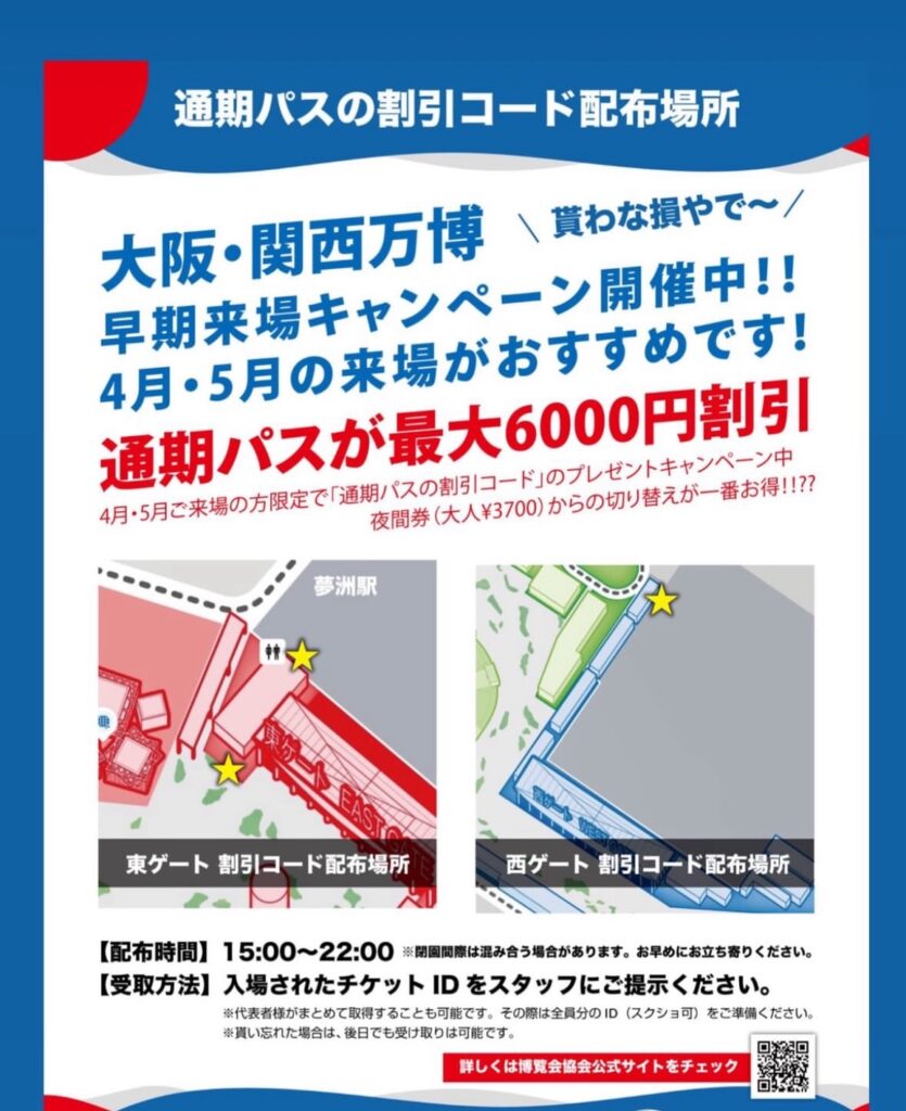 4月13日から5月31日までの期間に万博会場へ来場した人限定で配布される、通期パス(全期間有効パス)が割引価格で購入できる特別なコード