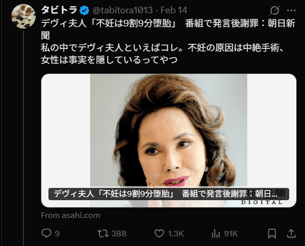 デヴィ夫人はインドネシア・スカルノ大統領の第3夫人でありバラエティー番組で活躍している人物。彼女は不妊について発言し炎上した過去があります。