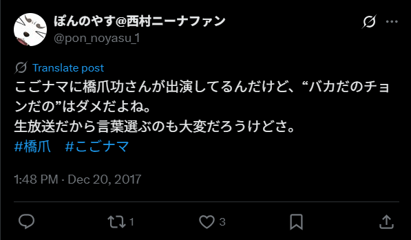 しかし差別を助長する言葉であるために放送禁止用語とされており、橋爪さんはどの発言か当初わかっていなかった模様。橋爪さんに何の説明もなしに、NHKアナウンサーに謝罪させた会社の対応もまずいのではないかといった意見も見られました。