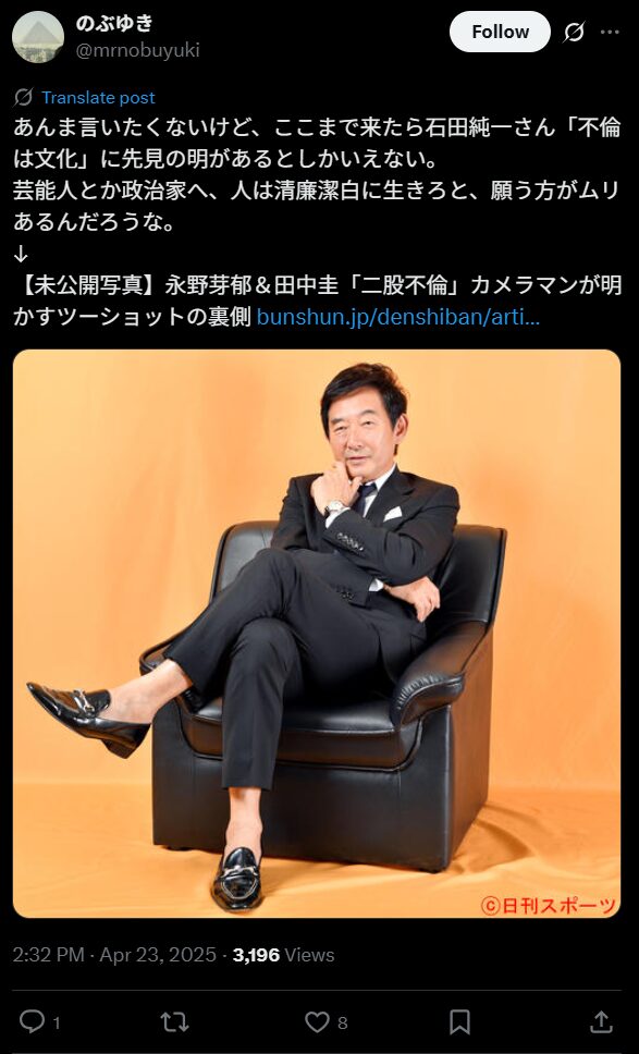 という見出しで掲載され、不倫は文化というキャッチフレーズが浸透。当時石田さんは妻子がいながら19歳年下のモデルと交際していたといわれており、取材陣がゴルフ大会にまで詰めかけていました。
