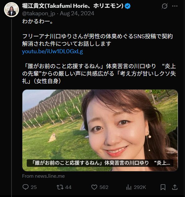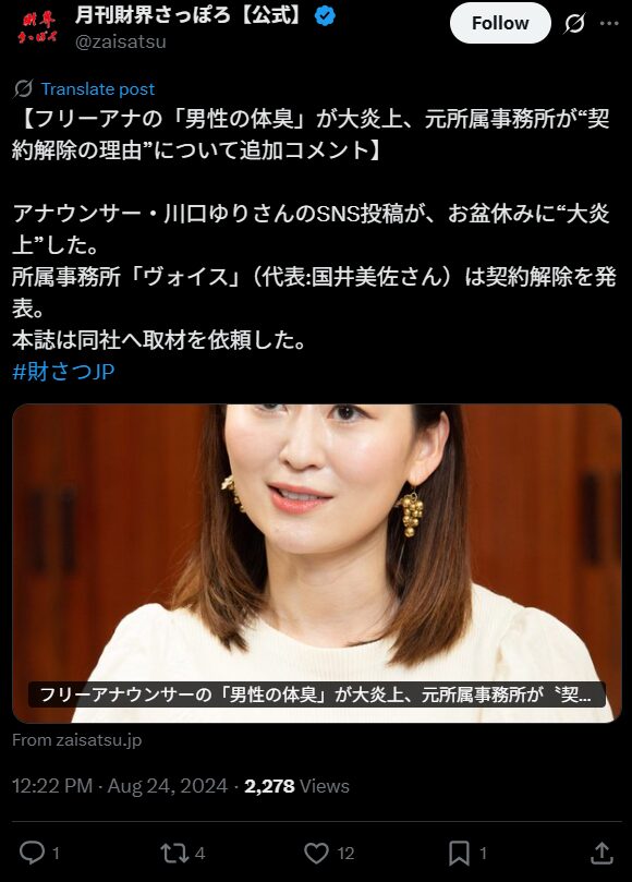 川口ゆりさんは元フリーアナウンサーやモデルなどで活躍していた人物。彼女は2024年に男性の体臭に対する内容をXで投稿し大炎上させてしまいました。