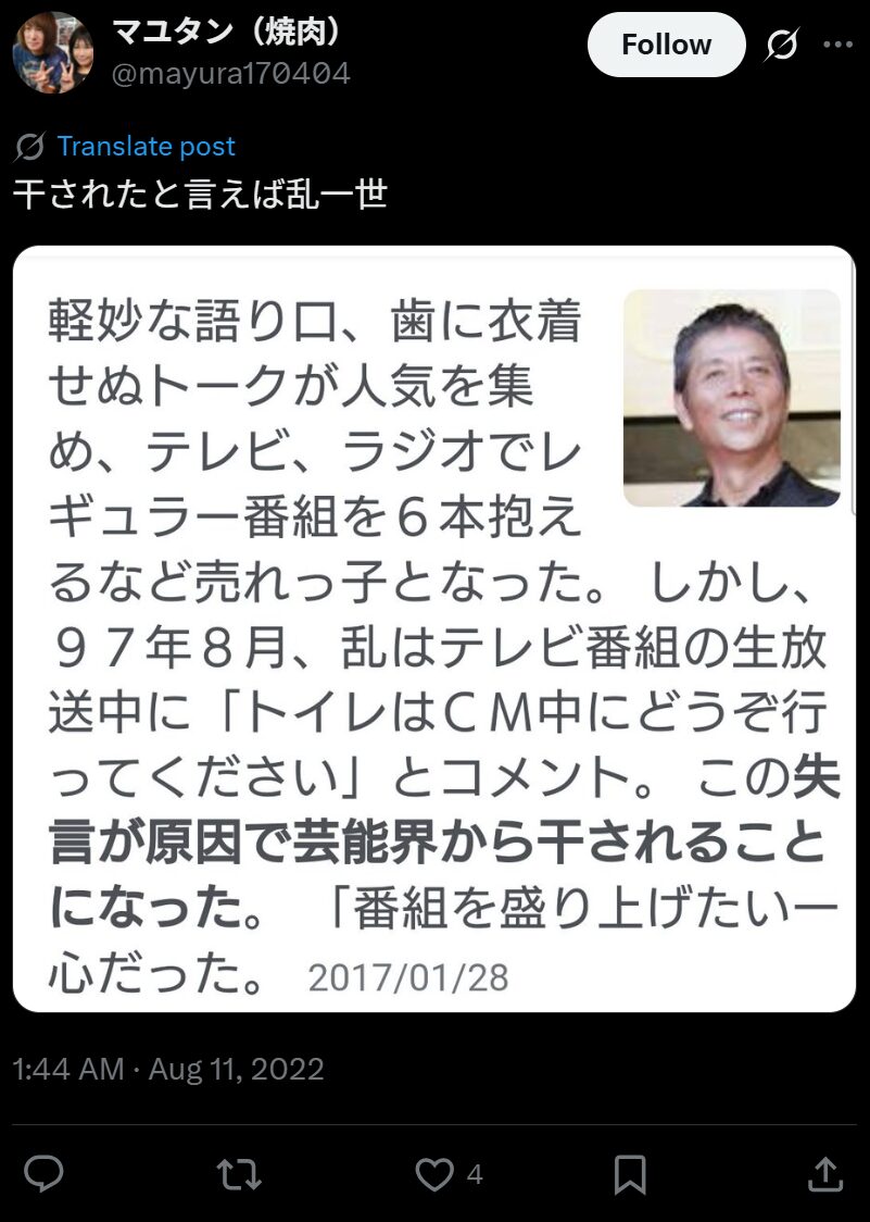 乱一世さんは90年代に「伝説のレポーター」といわれた人物。彼は1997年の深夜番組「トゥナイト2」で失言をしてしまい、芸能界を干されてしまいました。