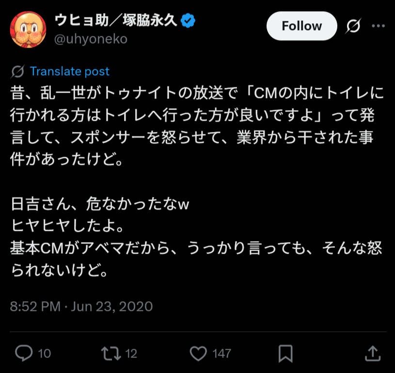 と発言、生放送であったためにカットされることなくお茶の間に流されてしまいました。この「CM中にトイレ」発言はスポンサーを怒らせてしまいます。