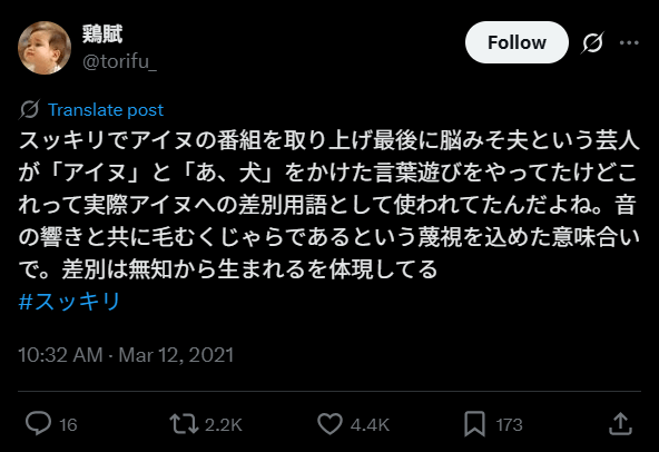 これはアイヌ民族に対しては絶対言ってはいけないことであり、昔は「犬」をアイヌ民族に対して侮辱する言葉として使っていたということです。おそらく脳みそ夫さんは言葉をかけて使用しただけだと思われますが、侮辱の言葉として反感を買いました。脳みそ夫さんはSNSで謝罪しています。