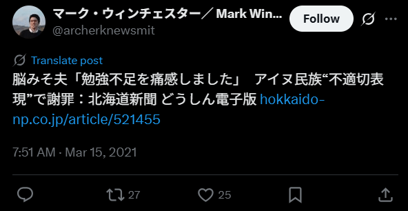 とアイヌ民族と動物をかけた発言をしています。