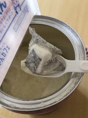 ・投稿者は生後1か月の息子のためにミルクを作ろうと半分ほど使った缶の底からスプーンですくった際、粉まみれのガーゼ状の異物と黒いテープが貼られた状態のものを発見。