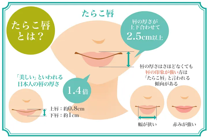 唇の厚さが上下合わせて2.5cm以上だと「たらこ唇」と言われるようです。
