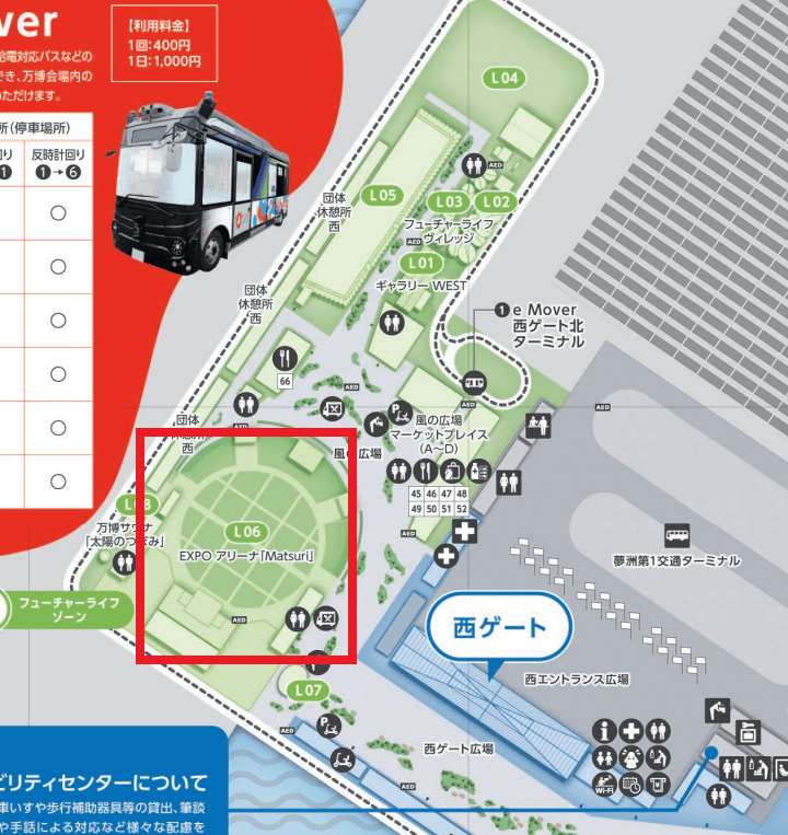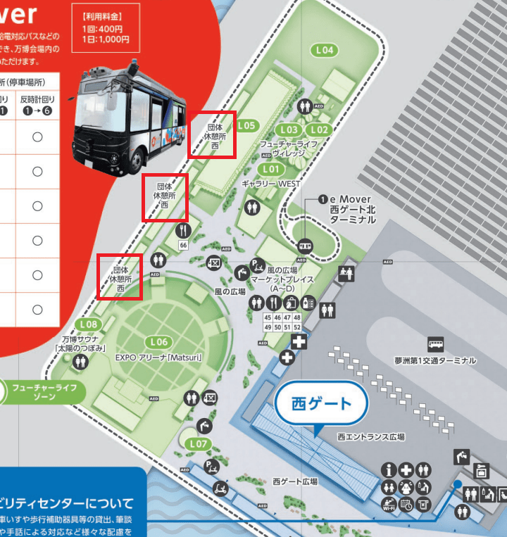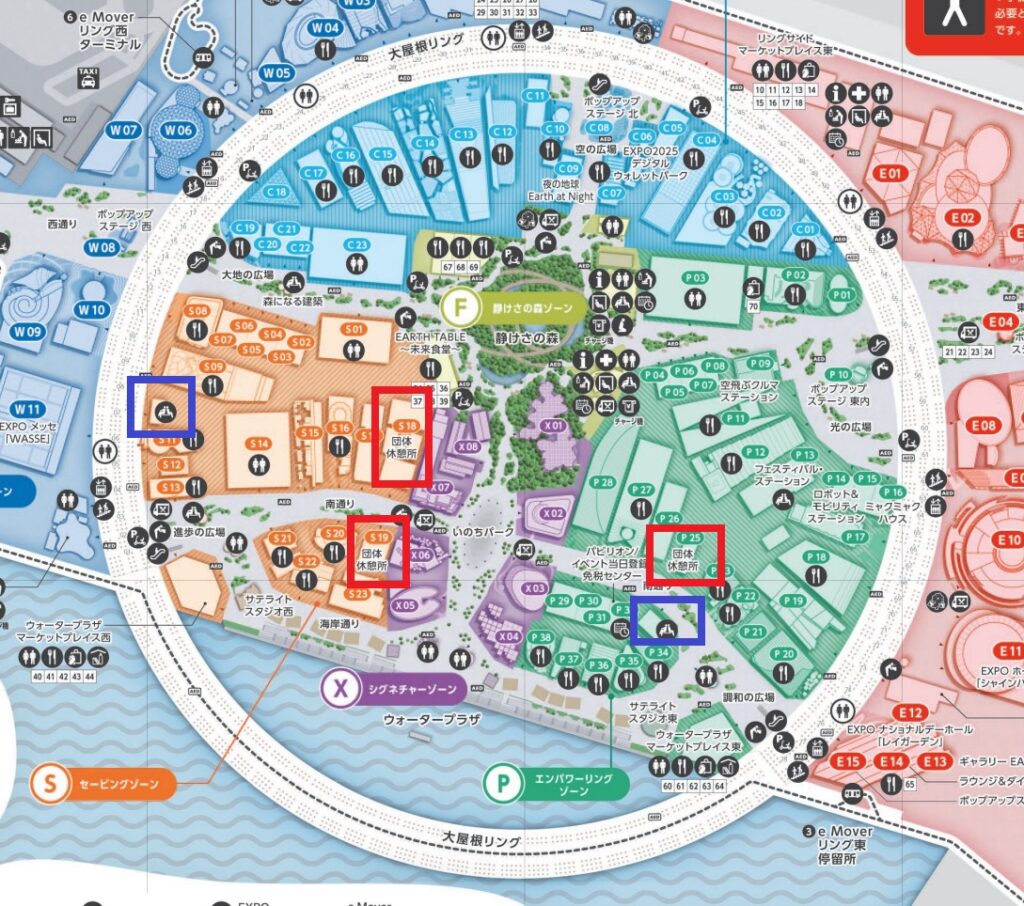万博会場内に団体休憩所は、画像の赤枠で囲っている西エリアに3つと中央エリアに3つで計6か所あります。