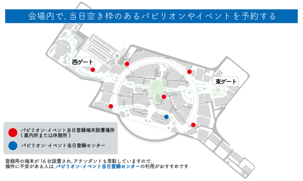 大阪・関西万博会場内には「パビリオン/イベント当日登録センター」や6カ所の案内所に当日登録端末機が合計24台設置されています。
